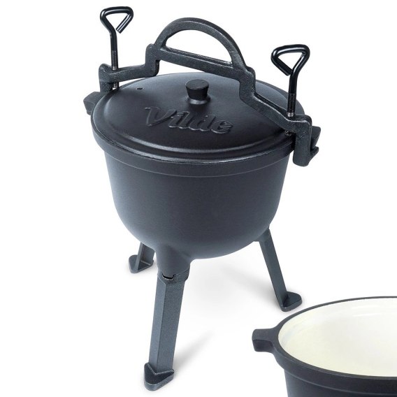 Okrągły kociołek żeliwny na nóżkach z pokrywką i uchwytem do zawieszenia, posiada emaliowany środek. Idealny do gotowania, pieczenia, duszenia oraz smażenia potraw na ognisku, grillu lub nad otwartym ogniem. Potrawy przygotowane w kociołku będą soczyste i aromatyczne. Przydatny w trakcie różnego rodzaju spotkań, uroczystości czy imprez organizowanych na świeżym powietrzu.