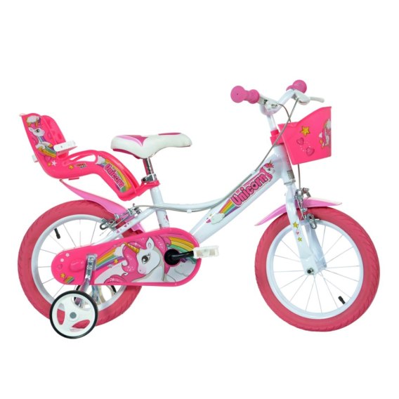 Rower dziecięcy Dino Bikes z motywem jednorożca oferuje estetyczny wygląd i szereg praktycznych akcesoriów. Obejmują one plastikowy koszyk na kierownicy i uchwyt na lalkę pod siodełkiem.