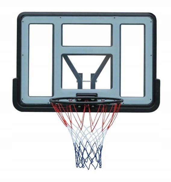 W skład kompletu wchodzi: tablica, obręcz, konstrukcja mocująca do ściany, siatka, zestaw montażowy