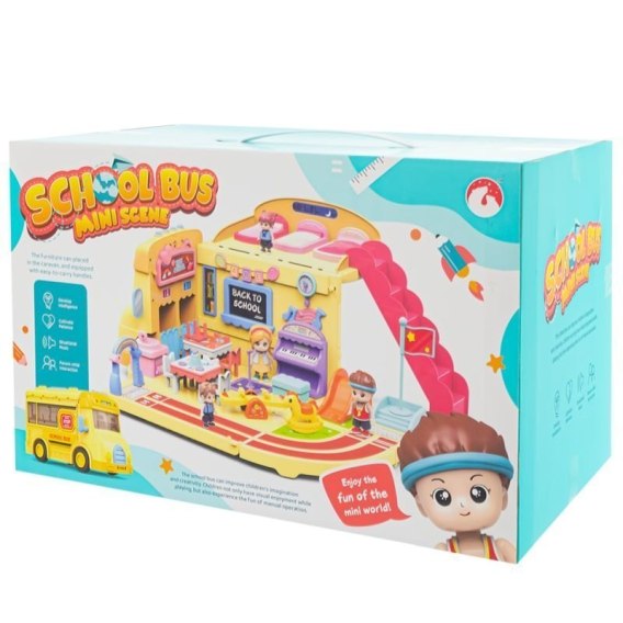 Otwierane ściany autobusu tworzą obszerną salę lekcyjną zawierającą wszystkie niezbędne akcesoria do prowadzenia lekcji. Znajdziemy tam tablicę, 2 szkolne ławki z krzesełkami, kącik do lekcji muzyki z fortepianem i mikrofonem. Do aktywnego spędzania czasu zachęca mini plac zabaw, boisko sportowe oraz tor wyścigowy.
