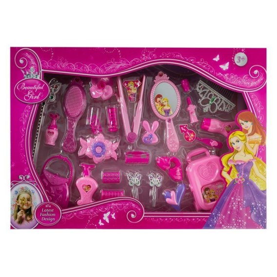 Zestaw piękności dla małej księżniczki, w skład którego wchodzi 25 elementów. Bogato wyposażony zestaw można używać do zabawy np. we fryzjera. Do zabawki dołączone są takie elementy jak: lusterko, szczotka spinki, korona.