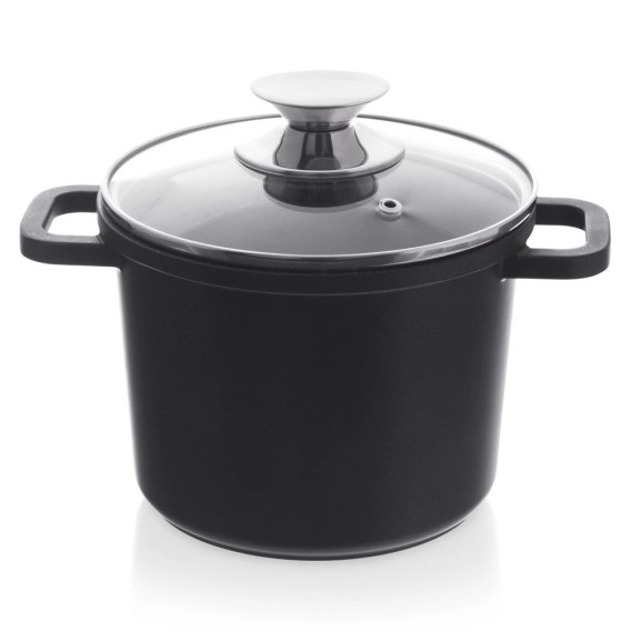 <li><strong>WYSOKI</strong> - Garnek o średnicy 17 cm i pojemności 2 l z pokrywką. Garnek wykonany z aluminium w czarnym kolorze, wewnątrz posiada nieprzywierającą powłokę granitową. Wyposażony w pokrywkę wykonaną ze szkła i stali nierdzewnej. Wymiary zewnętrzne garnka: 24 x 17 x 12,5 cm, wysokość z pokrywką wynosi 17 cm.</li>