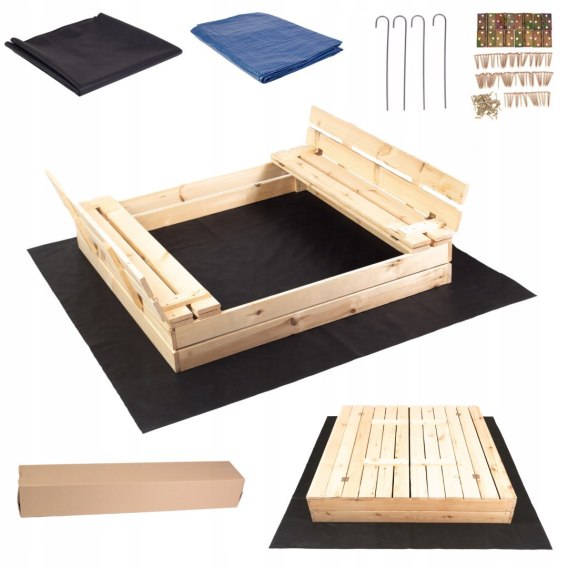 ⭐ zestaw zawiera: piaskownicę składaną z ławeczkami, plandekę ochronną wraz ze śledziami do mocowania, agrowłókninę izolacyjną, wkręty i zawiasy oraz instrukcję montażu. Całość jest opakowana w mocny 5-warstwowy karton.